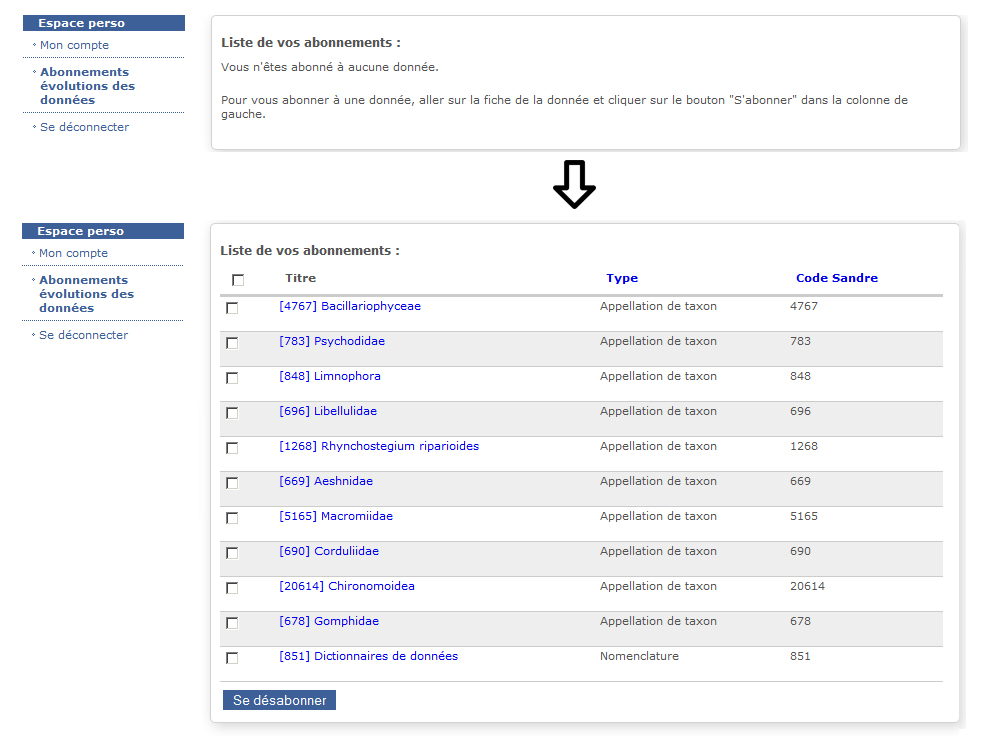 Avec ce lien, vous pouviez recevoir automatiquement un mail à chaque publication du Sandre : lors d'une publication, vous receviez par exemple les appellations de taxons créées au Sandre depuis la précédente publication du référentiel * des appellations de taxons.
